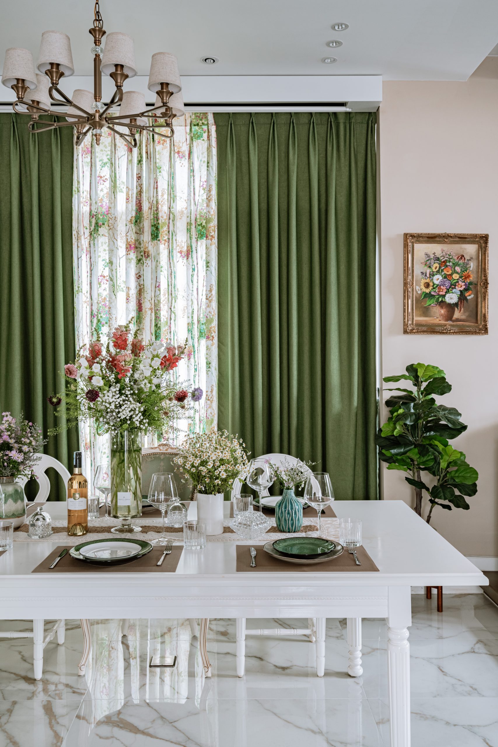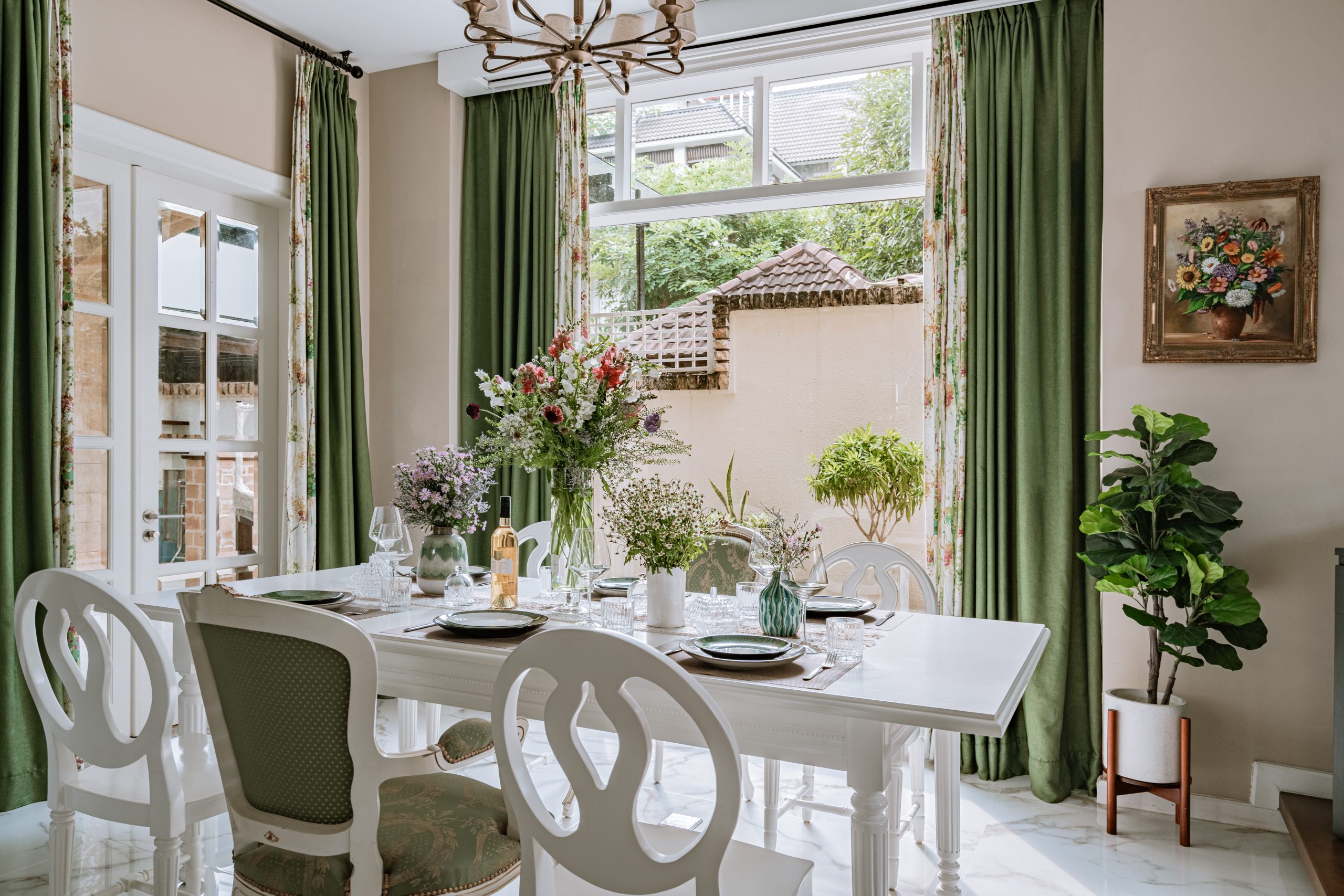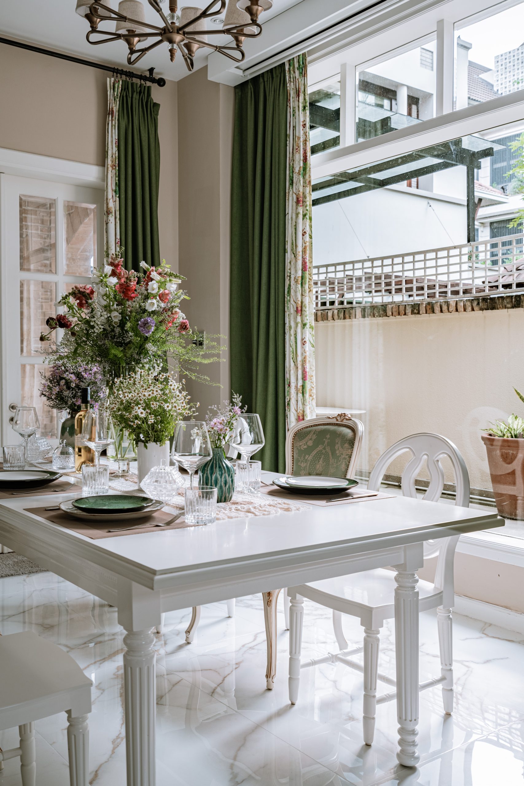 Tầm nhìn hướng ra khu vườn thông qua hệ cửa kính lớn, phòng ăn với bàn ăn màu trắng kết hợp cùng nền sàn đá trắng vân nhẹ mang đến không gian thanh khiết. Bàn ăn kiểu dáng bán cổ điển trang nhã cùng ghế bọc vải, điểm xuyết hoa văn nhẹ nhàng trên rèm cửa, tạo không gian thanh lịch nhưng không cầu kỳ. Ánh sáng tự nhiên cùng đèn chùm mang lại cảm giác ấm cúng, phù hợp cho cả những bữa ăn sum họp gia đình lẫn các buổi tiếp đãi thân mật.