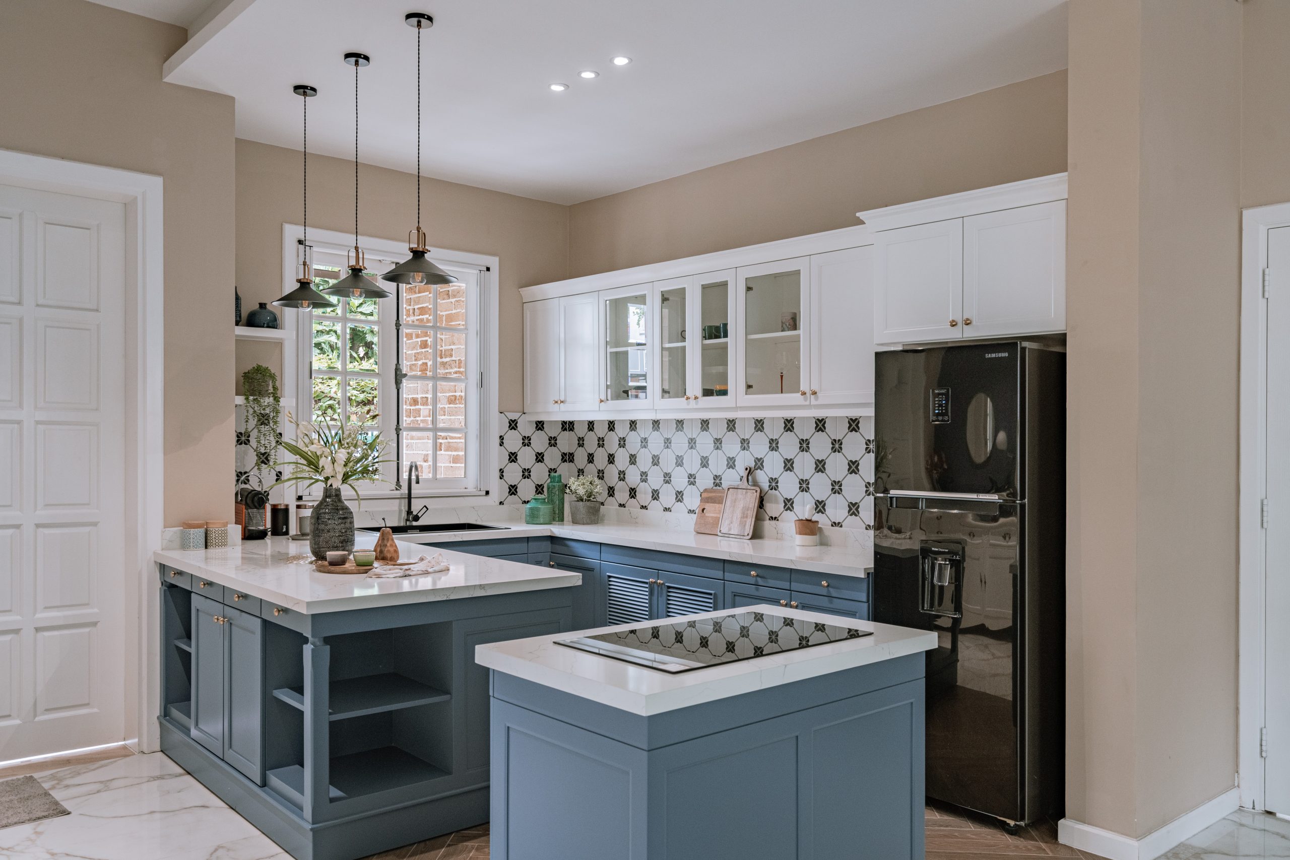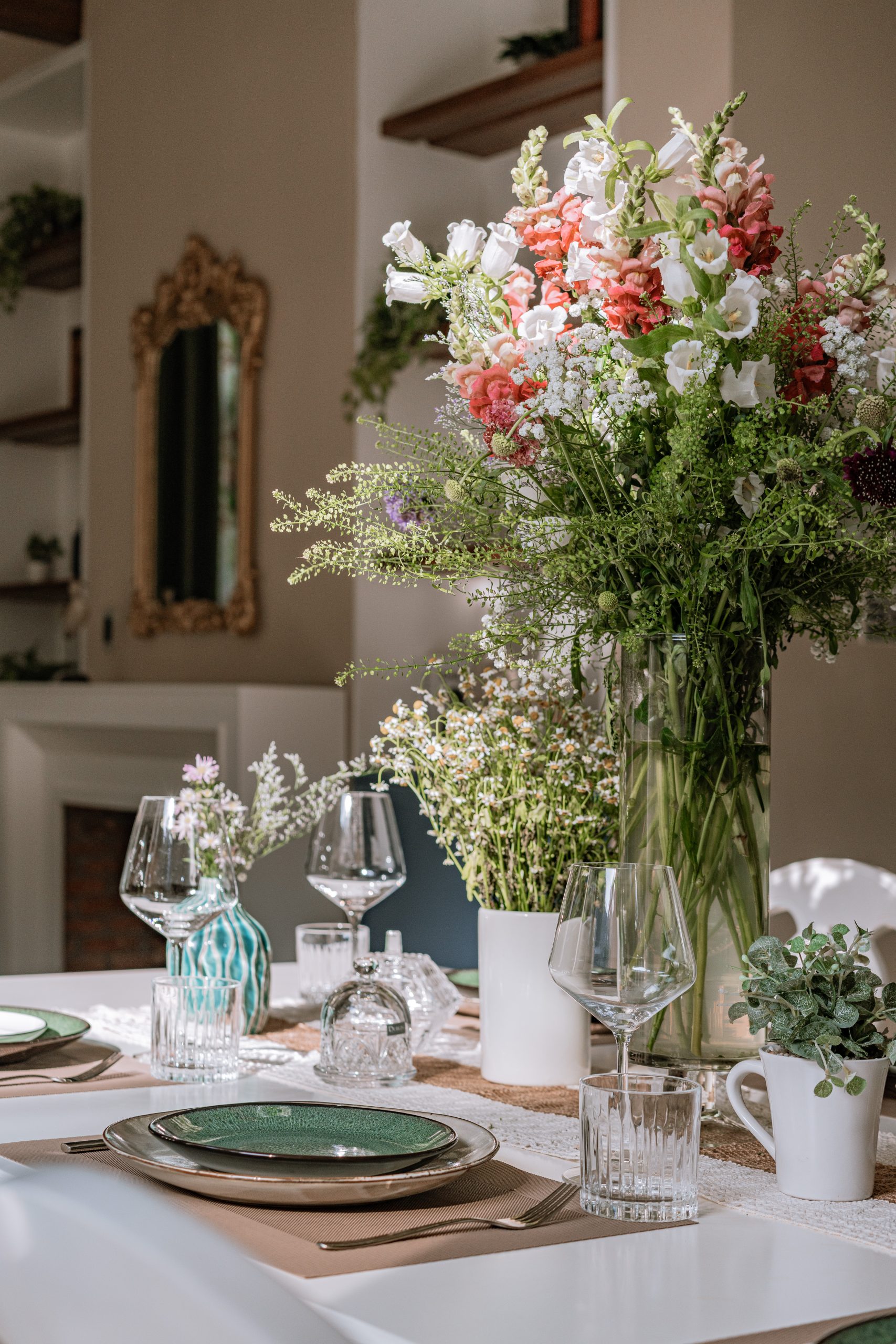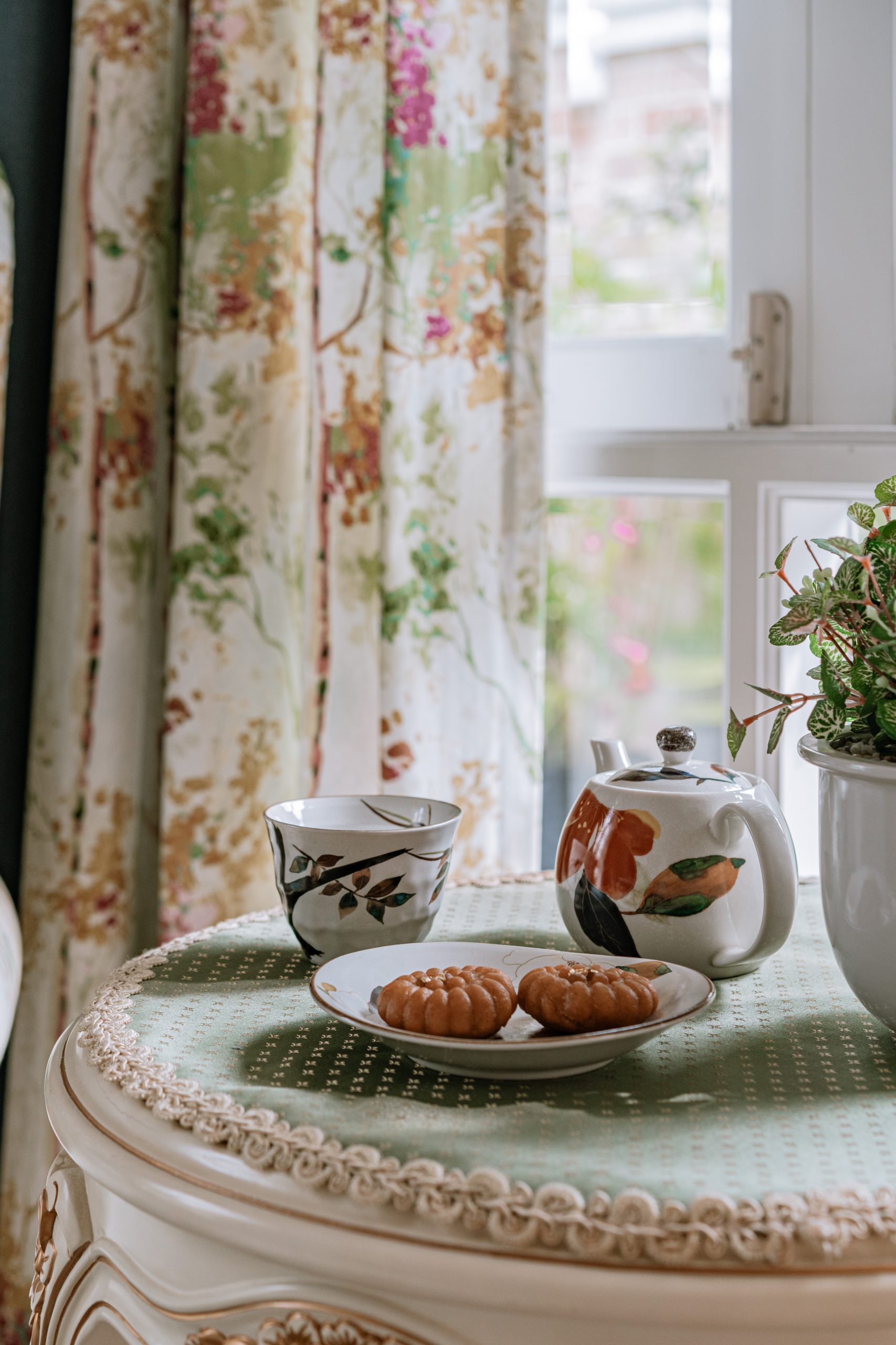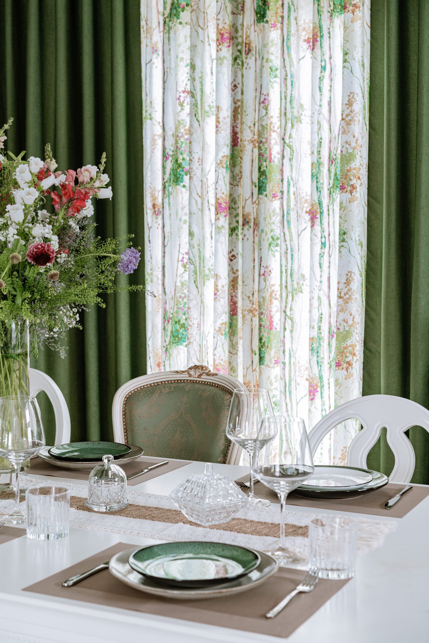 Tầm nhìn hướng ra khu vườn thông qua hệ cửa kính lớn, phòng ăn với bàn ăn màu trắng kết hợp cùng nền sàn đá trắng vân nhẹ mang đến không gian thanh khiết. Bàn ăn kiểu dáng bán cổ điển trang nhã cùng ghế bọc vải, điểm xuyết hoa văn nhẹ nhàng trên rèm cửa, tạo không gian thanh lịch nhưng không cầu kỳ. Ánh sáng tự nhiên cùng đèn chùm mang lại cảm giác ấm cúng, phù hợp cho cả những bữa ăn sum họp gia đình lẫn các buổi tiếp đãi thân mật.