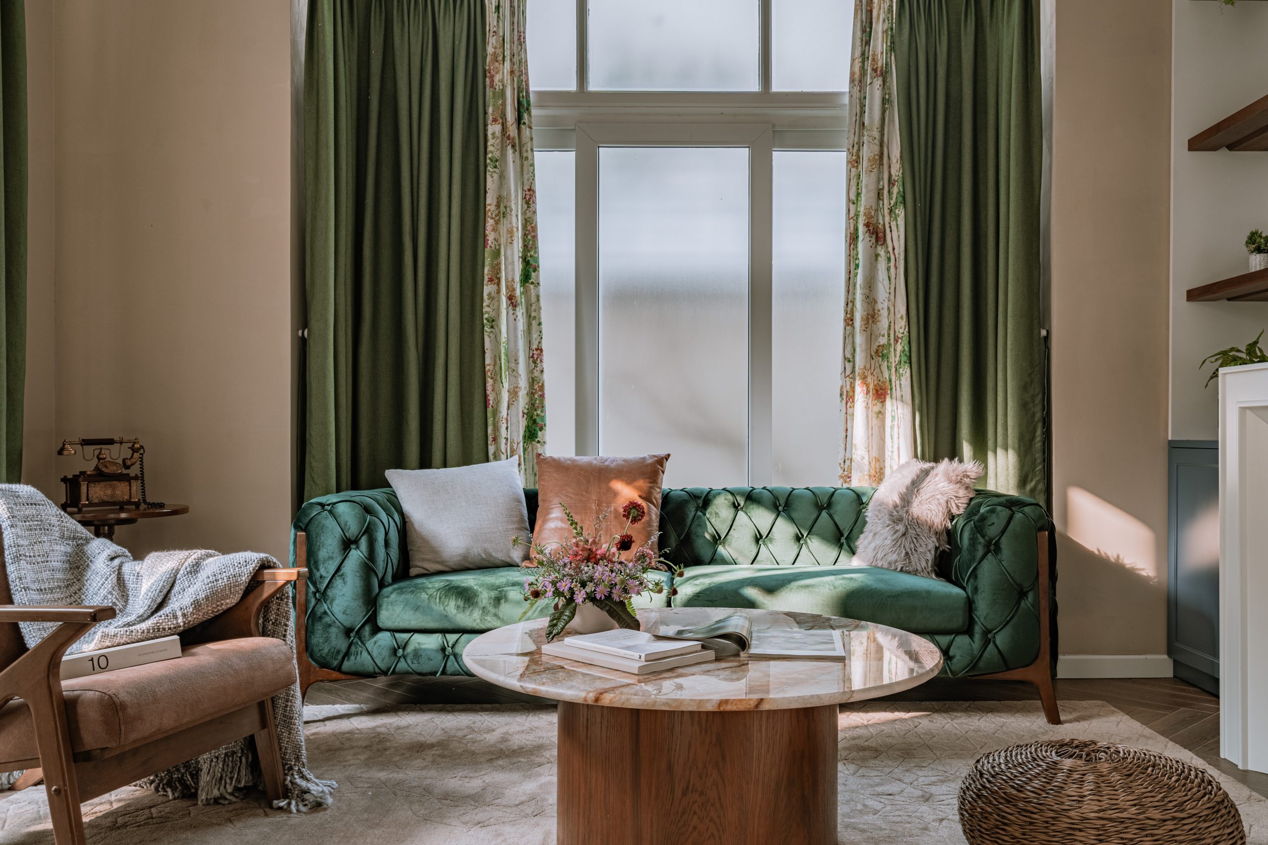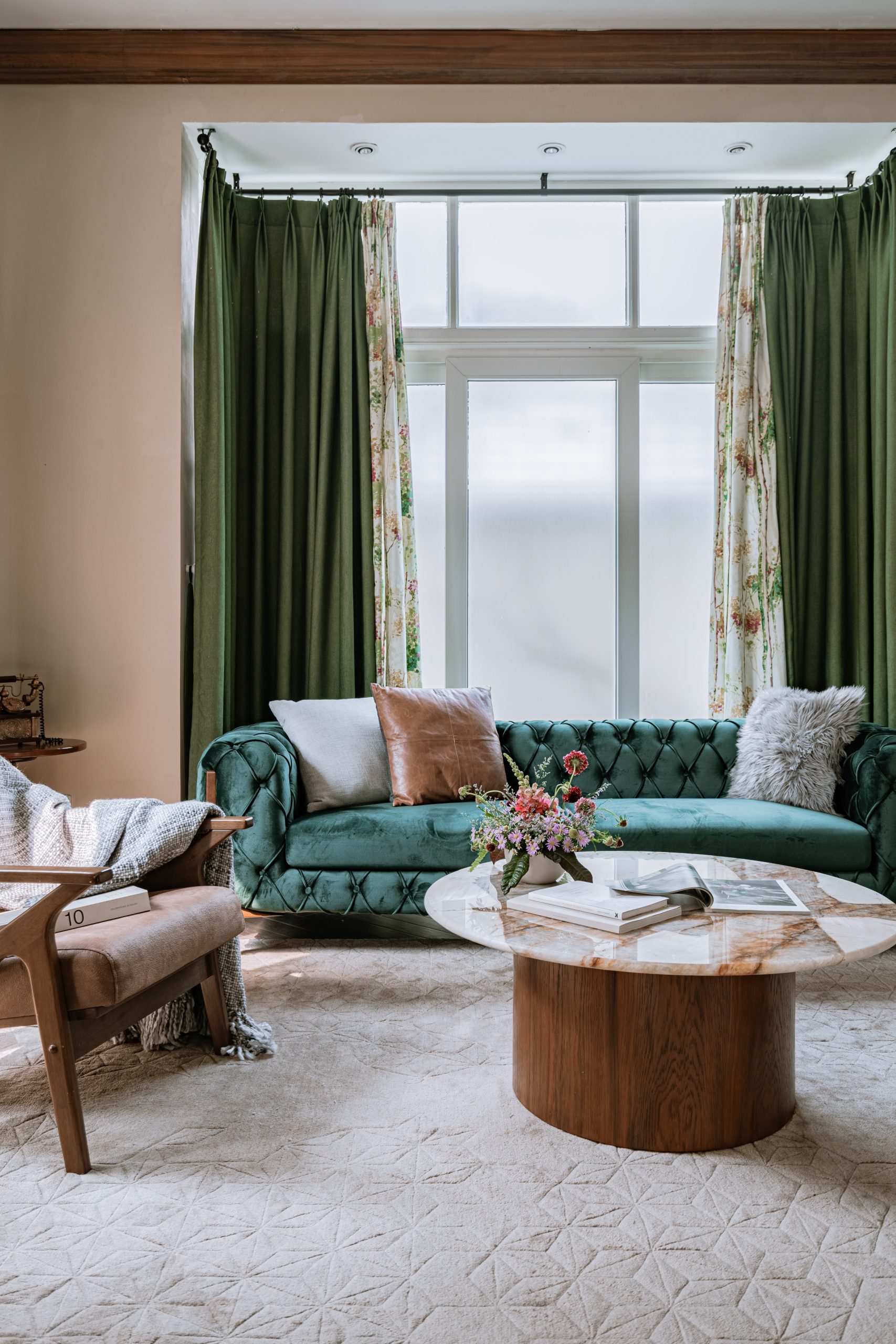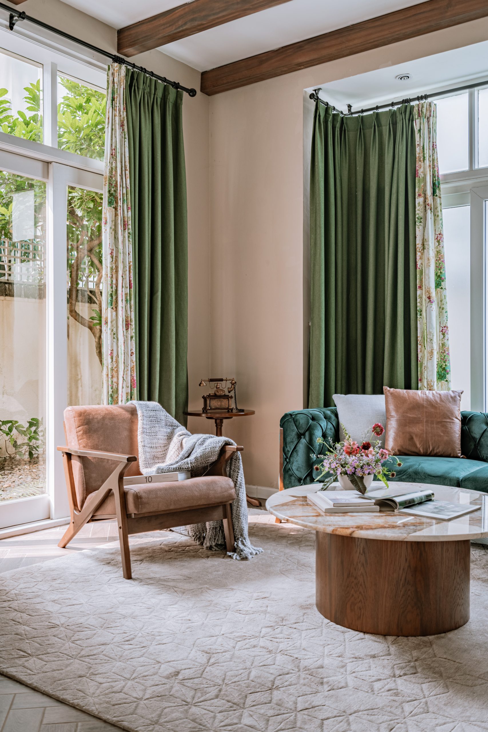Phòng khách được mở rộng theo chiều cao, kết hợp xà gồ gỗ trang trí cùng điểm nhấn lớn là hệ cửa sổ cao và rộng, giúp ánh sáng tự nhiên tràn ngập suốt cả ngày, tạo sự kết nối phòng khách với khu vườn bên ngoài. Bộ sofa bọc vải tông xanh trầm kết hợp gối màu pastel mang đến cảm giác êm ái, buông thư. Kế bên là lò sưởi, không chỉ là điểm nhấn thị giác mà còn gợi cảm giác quây quần, ấm áp về đêm.