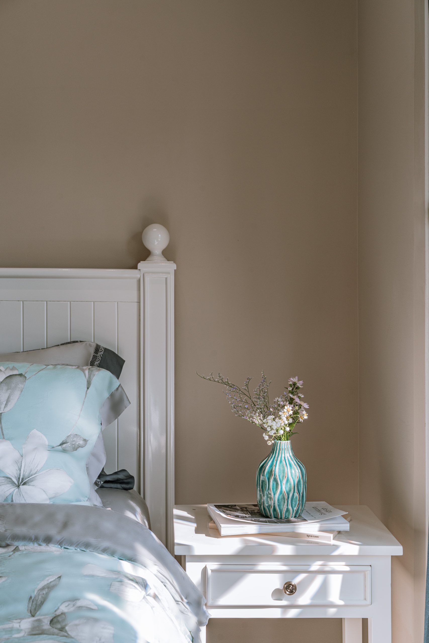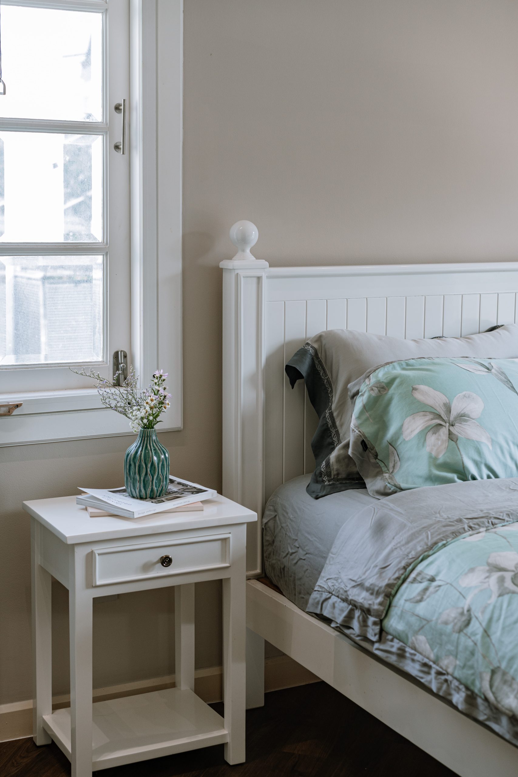 Ấn tượng không kém là phòng ngủ – không gian riêng tư nhất. Được thiết kế tối giản với sàn gỗ tông ấm kết hợp nội thất trắng kem, phòng ngủ có rèm vải hoa nhã nhặn và đồ décor tinh tế mang lại cảm giác thư giãn, vừa giúp không gian luôn nhẹ nhàng và dễ chịu. Các cửa sổ lớn được bố trí hợp lý để đón ánh sáng tự nhiên vào buổi sáng, đồng thời đảm bảo sự thông thoáng, luôn đem đến năng lượng tươi mới cho chủ nhân.